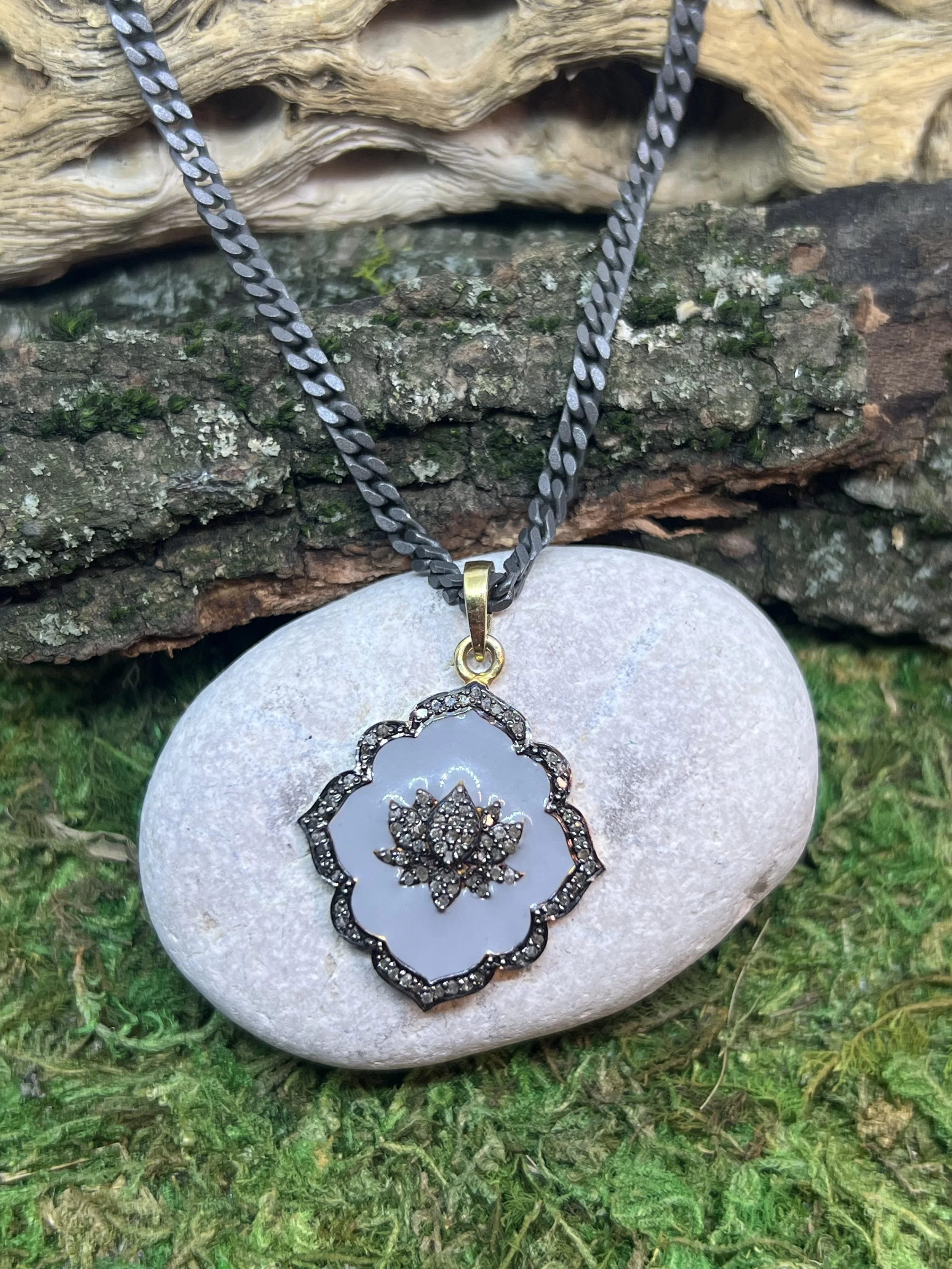“In Sanskrit, Padma (पद्म) means lotus flower”—a symbol of purity, resilience, and transformation. This 18” diamond-accented lotus pendant glows in two-tone black rhodium and gold-plated enamel. Bold, luminous, and made to be seen.