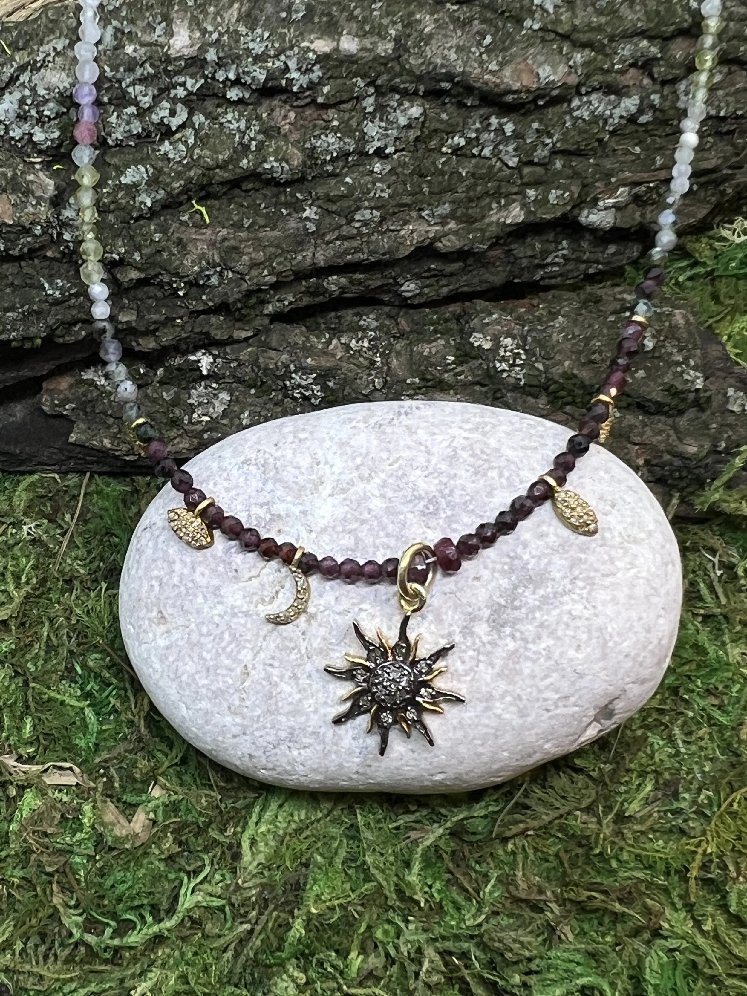(A 16" strand of multi-shaded garnet & tourmaline beads centered by a silver and gold-plated sun pendant— Six tiny gold-plated diamond charms add a touch of shimmer and elegance. Grounding, radiant, and effortlessly unique. SUN (Diamond Sterling Silver Two-Tone Black Rhodium and Gold Plated) Size: 14mm. Thickness: 2mm)
