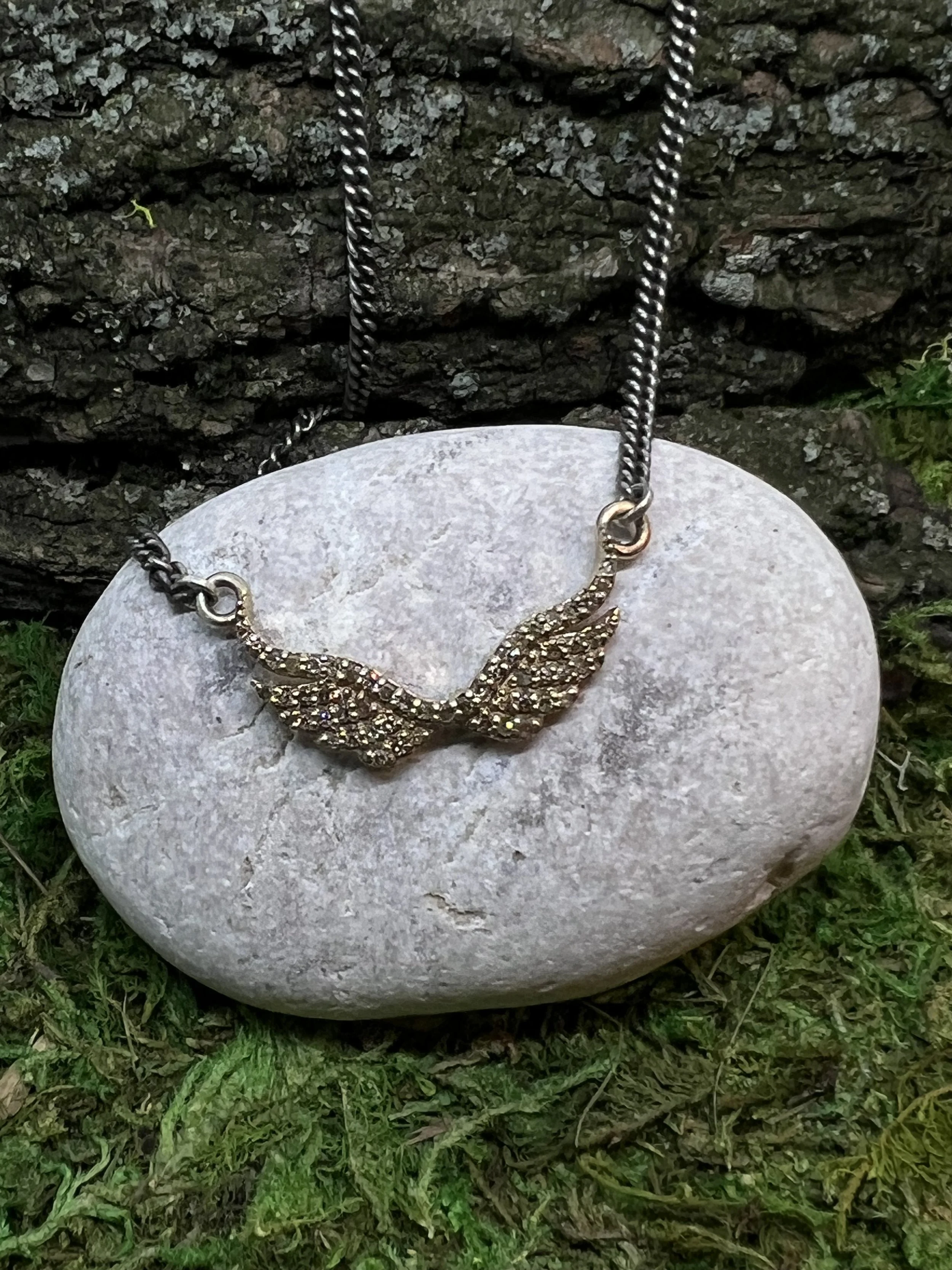 Delicate and luminous, this 14” necklace features diamond-studded wings, representing your quiet inner strength and freedom. It rests close to the collarbone, offering a subtle shimmer and an empowering reminder to rise.